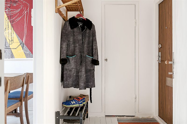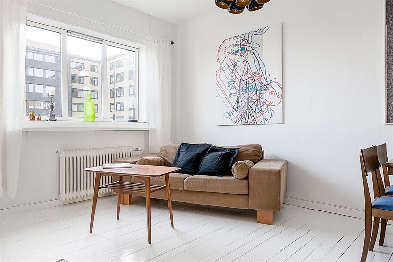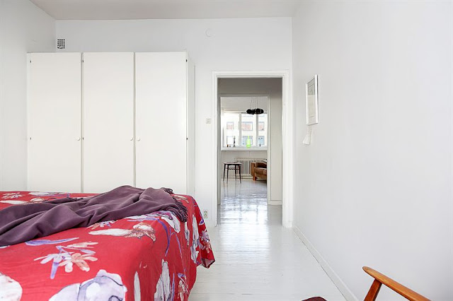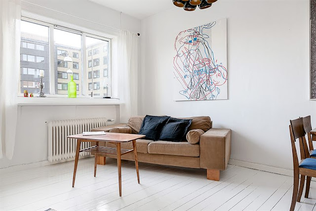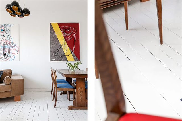 Ściany są białe, podłoga drewniana bielona. W tym minimalistycznym wnętrzu zastosowano niewiele dekoracji, ale o zdecydowanych designie: obrazy na ścianach, lampa wisząca.