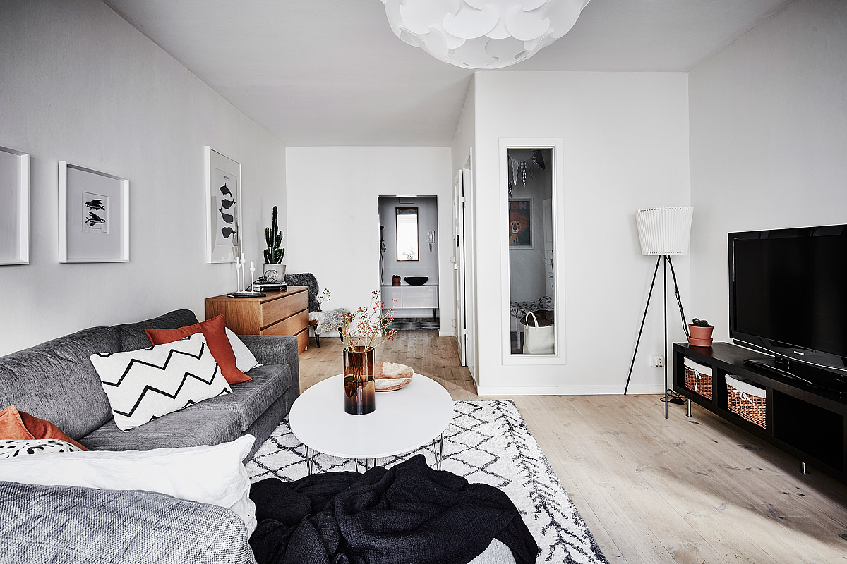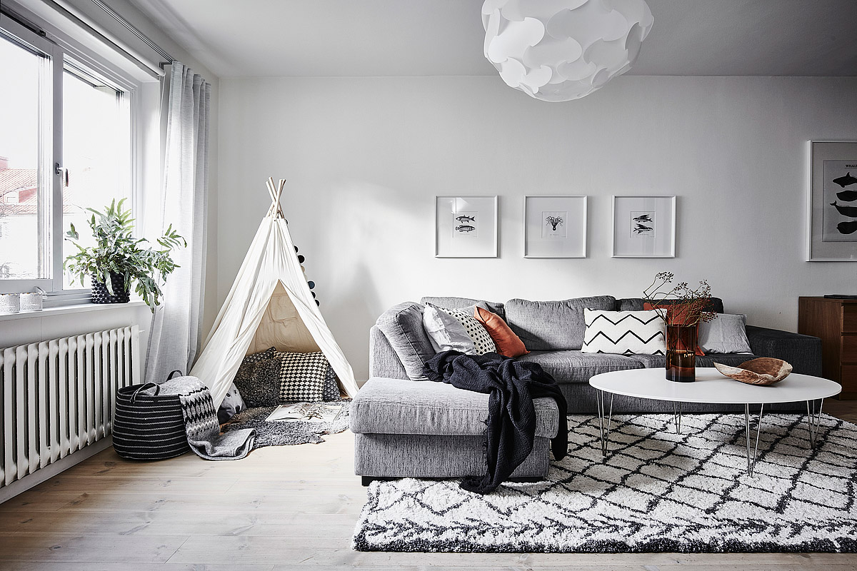 W tej aranżacji pokój dziecka został wydzielony z pokoju dziennego. Mieszkanie jest urządzone w skandynawskim stylu, co widać w każdym pomieszczeniu. Salon, pokój dziecka, sypialnia rodziców oraz kuchnia to jasne pomieszczenia z przewagą koloru białego. W salonie pojawiają się także szarości, beże, brąz oraz czerń, w sypialni granat (narzuta na łóżko), a w pokoju dziecka czerwień (regał, dywanik) oraz wielobarwne dodatki.