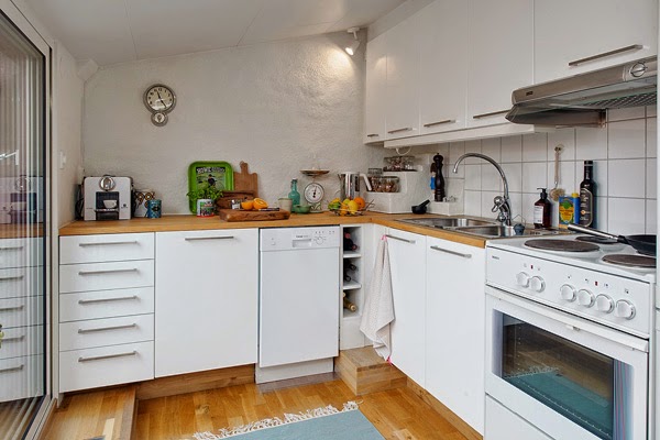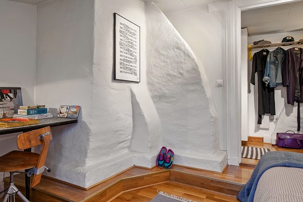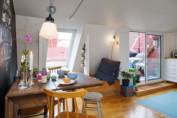 Mieszkanie położone na poddaszu budynku. Ma 50m2 powierzchni i dwa pokoje. Położone jest na poddaszu, ale bardzo osobliwym, ściany wyglądają jak wykonane z kamienia. Jasne kolory dają wrażenie przestronności pomimo niewielkich rozmiarów. Skandynawowie według mnie są mistrzami łączenia starego z nowym, w tej aranżacji świadczą o tym m.in. designerskie krzesła połączone z fotelami, które wyglądają jak ze starego kina !