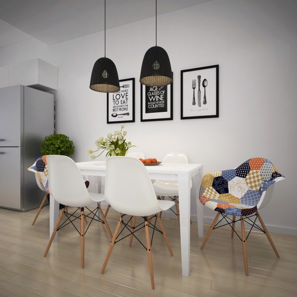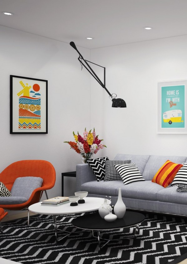 W salonie dominuje szara sofa, ożywiona kolorowi plakatami w białych i czarnych ramach. Dodatkowo umieszczono także pomarańczowy fotel i kolorowe poduszki. Dywan czarno-biały ładnie wypełnia przestrzeń. Ściana, na której powieszono telewizor zaaranżowano w minimalistycznej formie. Stół biały z krzesłami Eames, na ścianie powieszono odpowiednie plakaty (z motywem kuchennym).