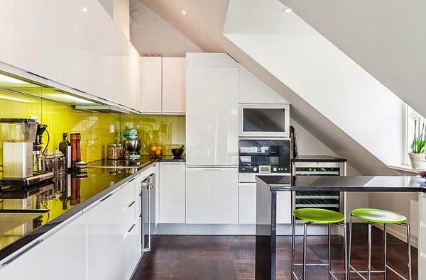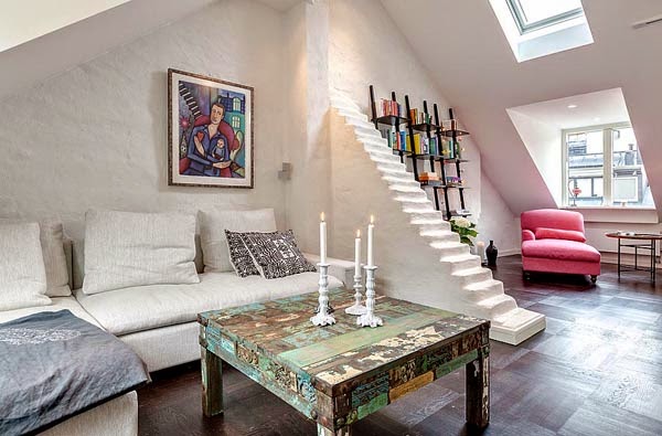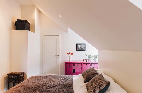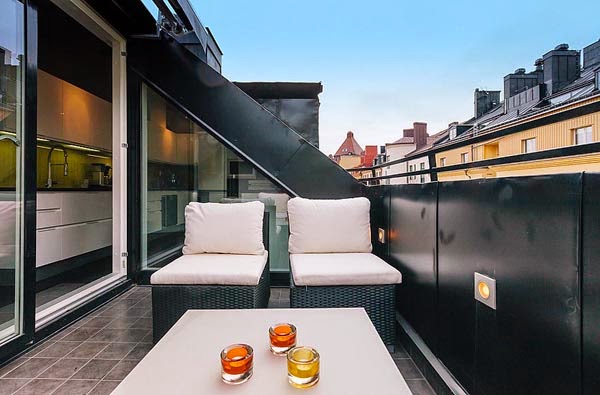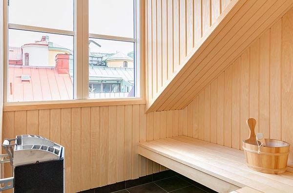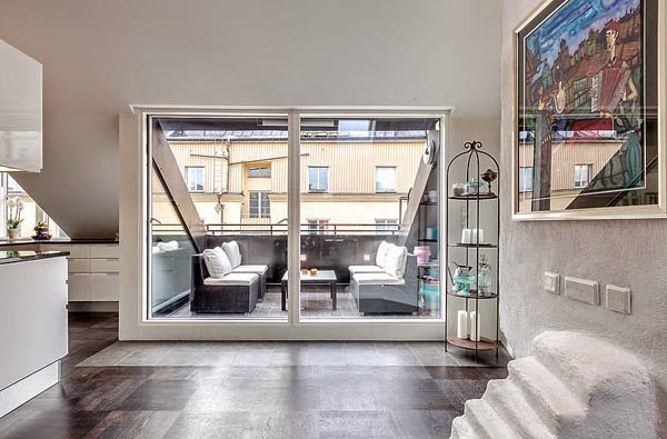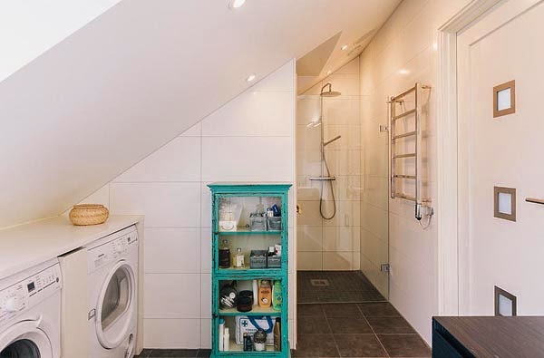 Mieszkanie o powierzchni 111m2. Położone na poddaszu budynku położonego w Szwecji. Z urządzeniem „trudnej przestrzeni ze skosami” poradzono sobie bardzo dobrze. Ciekawie podzielono także powierzchnię na środku mieszkania – widoczne przy aneksie kuchennym, jednocześnie zachowując charakter otwarty mieszkania. Jak przystało na skandynawskie mieszkanie dodatkową atrakcje stanowi sauna (oczywiście nie ma jej w każdym mieszkaniu, ale w tym rejonie geograficznym to popularne rozwiązanie) oraz bardzo przytulny taras.