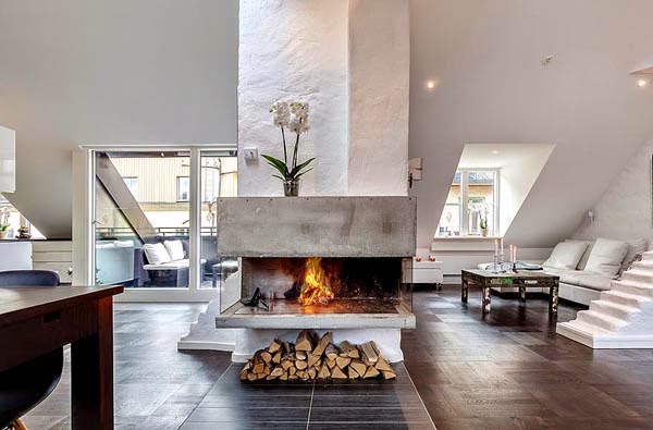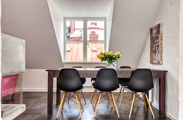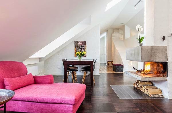 Mieszkanie o powierzchni 111m2. Położone na poddaszu budynku położonego w Szwecji. Z urządzeniem „trudnej przestrzeni ze skosami” poradzono sobie bardzo dobrze. Ciekawie podzielono także powierzchnię na środku mieszkania – widoczne przy aneksie kuchennym, jednocześnie zachowując charakter otwarty mieszkania.  Jak przystało na skandynawskie mieszkanie dodatkową atrakcje stanowi sauna (oczywiście nie ma jej w każdym mieszkaniu, ale w tym rejonie geograficznym to popularne rozwiązanie) oraz bardzo przytulny taras.
