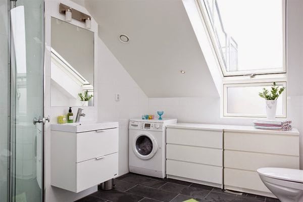 Mieszkanie na poddaszu o powierzchni 45m2. Dzięki zastosowaniu bieli w kolorze ścian i mebli wnętrze wydaje się być zdecydowanie większe. Kolor podłogi – jasny dąb także bardzo fajnie rozświetla przestrzeń. „Skosy” nie są łatwe do aranżacji, a tu poradzono sobie modelowo, głównie dzięki kolorystyce i zachowaniu minimalizmu.