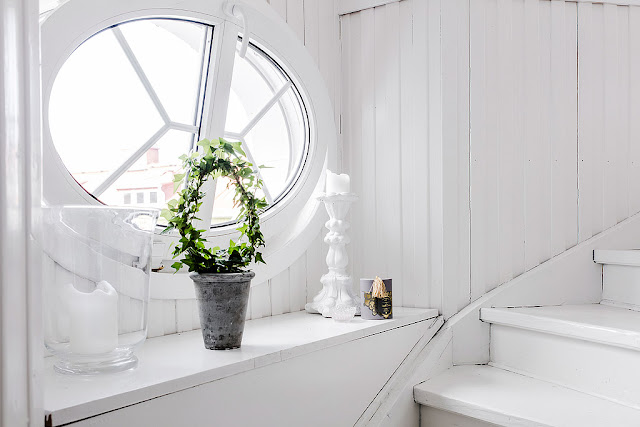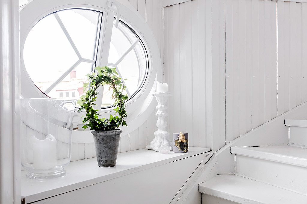W tej aranżacji okna dachowe nie są dużych rozmiarów, ale każde pomieszczenie jest ładnie doświetlone. Przy schodach zamieszczono nawet okrągłe ozdobne okno w ścianie budynku. W tym mieszkaniu ściany pomalowano na biały kolor, ciekawie także wyeksponowano drewniane belki (element