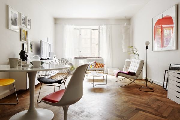 Mieszkanie o powierzchni 71m2. Położone w Szwecji, jednak trochę inne od większości skandynawskich aranżacji. Co je wyróżnia? Nowoczesny charakter, który został „wprowadzony” do wnętrza, dzięki wyposażeniu go w designerskie meble. Obecność pikowanej sofy projektu Mies Van Der Rohe, albo krzesła Tulip projektu Eero Saarinen sugeruje, że włąściciel lubi otaczać się designerskimi produktami. Repliki wielu designerskich mebli w dobrej cenie można kupić w sklepie Voga.