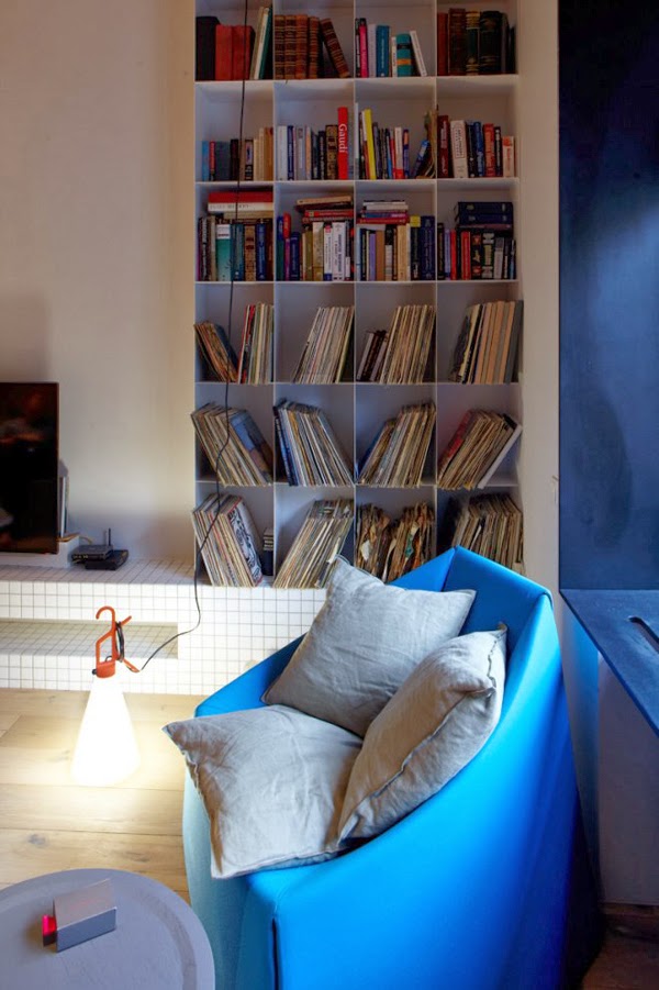 Regał na książki jak z papieru 🙂 Nie rozumiem lampy w łazience. Nie dogadałabym się z kablem.