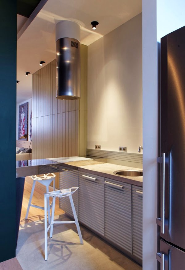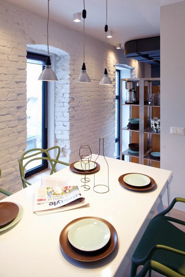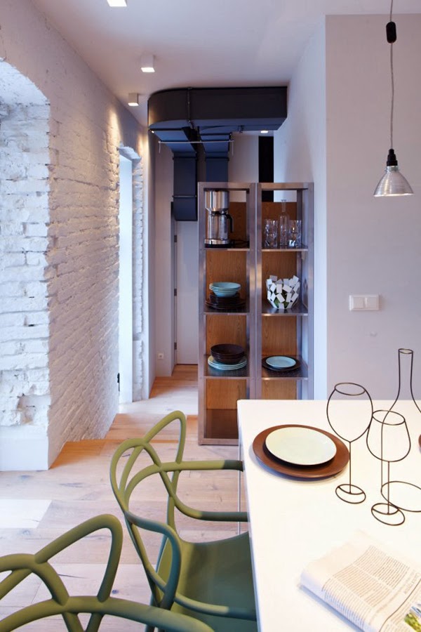 Nowoczesne mieszkanie znajduje się w Kijowie, Ukraina. Wyróżniającym elementem w tym wnętrzu jest podział stref (dziennej, sypialnianej i dla gości) dodatkowo przez różnicę poziomów. Mieszkanie ma 80m2 i pełne jest designerskich dodatków (jak ptak Eames firmy Vitra – cena ok. 600 zł).