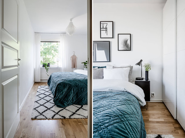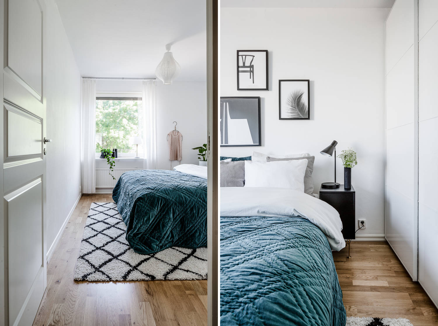 W sypialni ściany pomalowano także na biały kolor, beżowa podłoga, na środku postawiono duże łóżko, a nad nim powieszono obrazki. W sypialni znalazło się także miejsce na szafę.