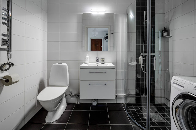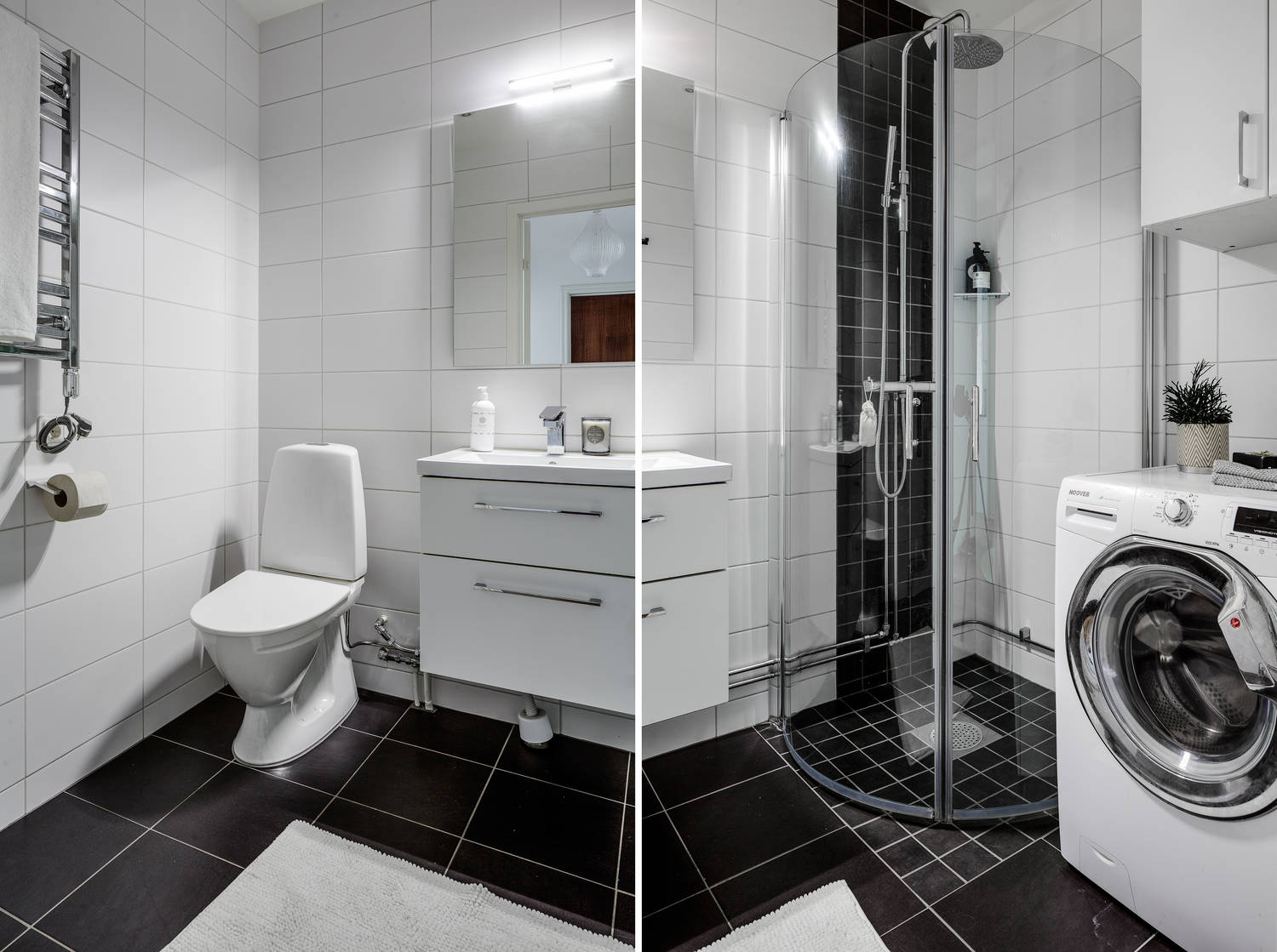 Łazienka także z przewagą bieli w połączeniu z grafitem (płytki w tym kolorze położono na podłodze oraz w części kabiny prysznicowej.