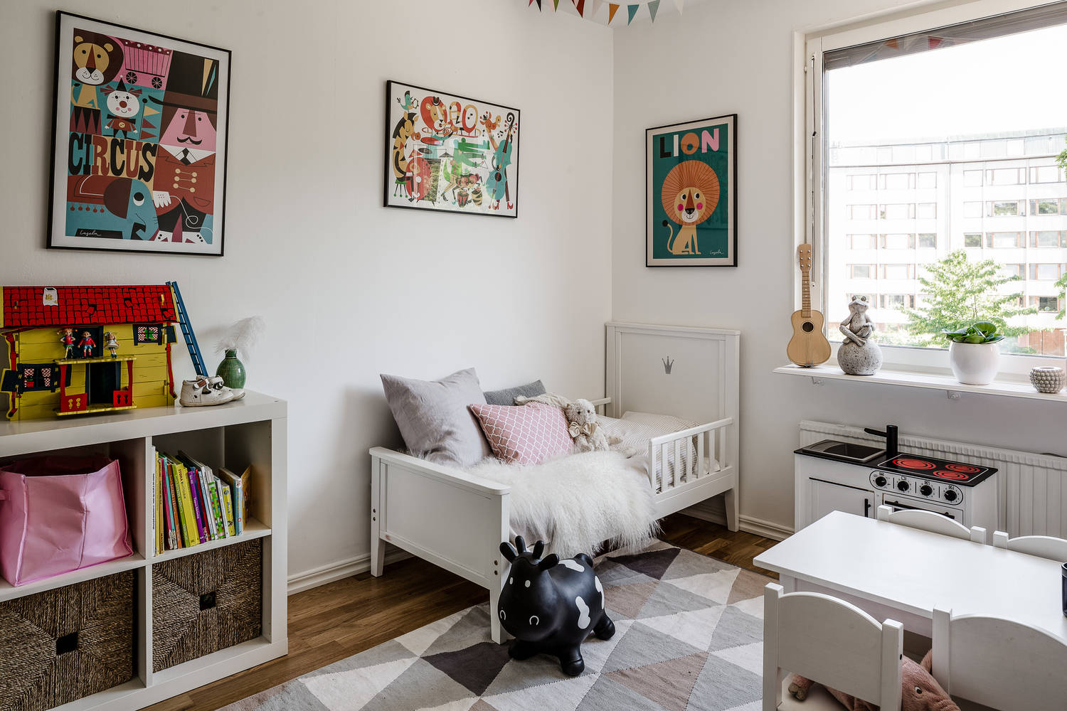 Dziecięcy pokój w skandynawskim stylu. Dużo bieli: ściany, łóżeczko z koroną, stół z krzesłami do zabawy, regał, drewniana podłoga oraz kolorowe dodatki: poduszki, obrazki.