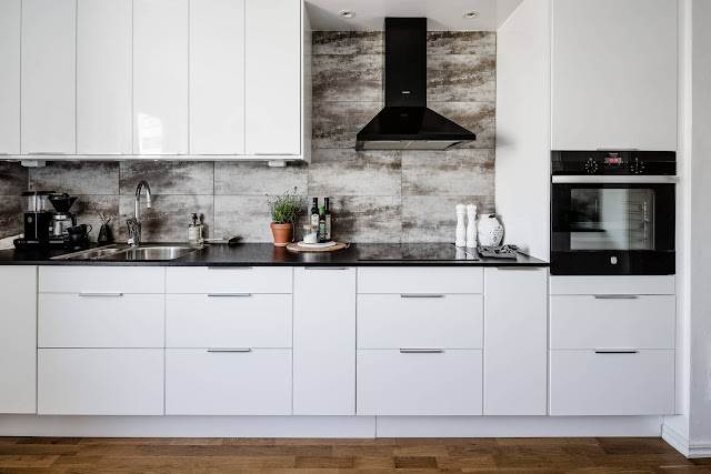 W kuchni dominuje kolor biały (szafki, stół, firanki) oraz czerń (blat kuchenny, okap, krzesła, sprzęt AGD). Charakterystyczne są także płytki naścienne, przypominające elewacje betonowe.