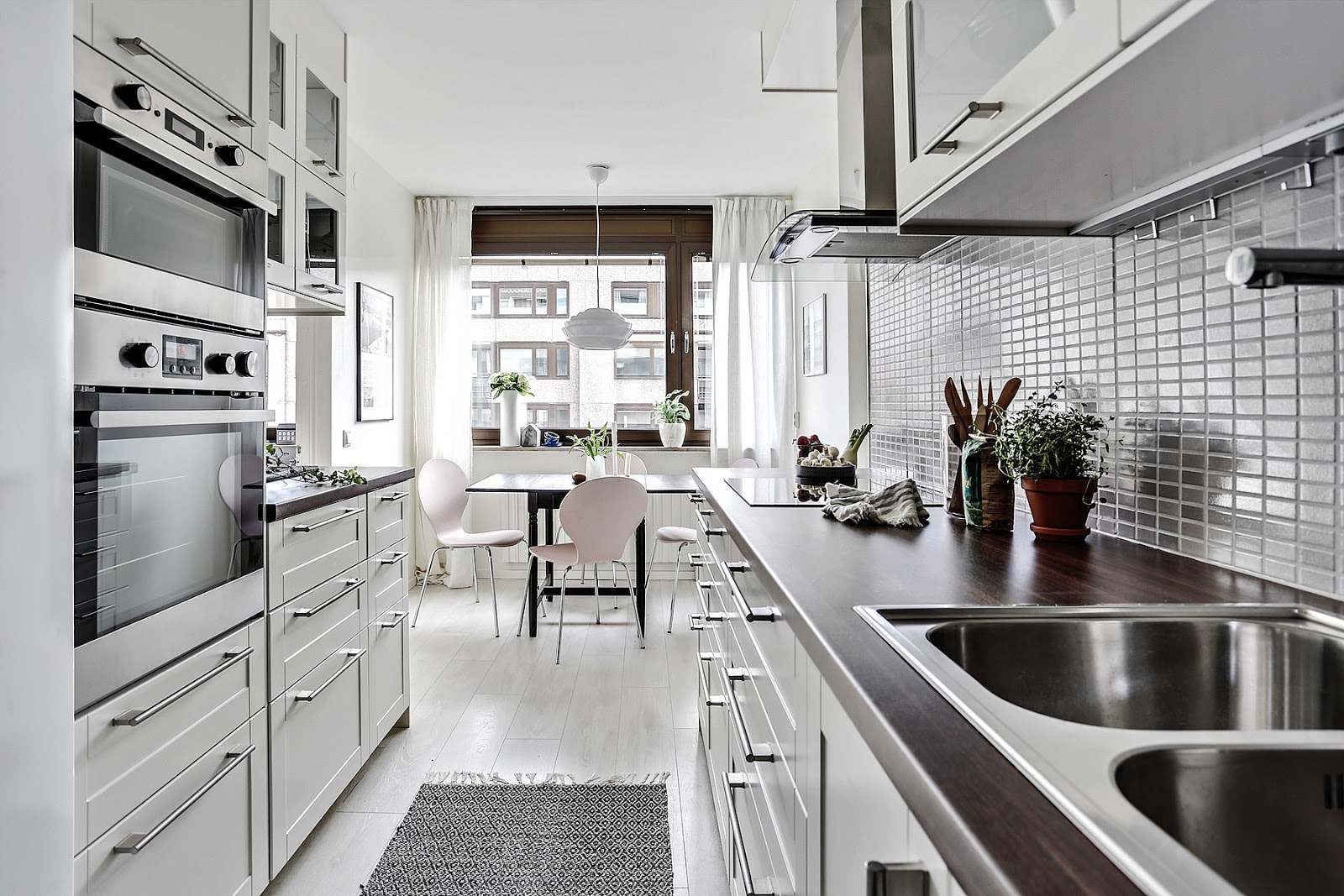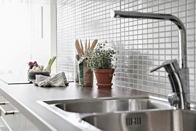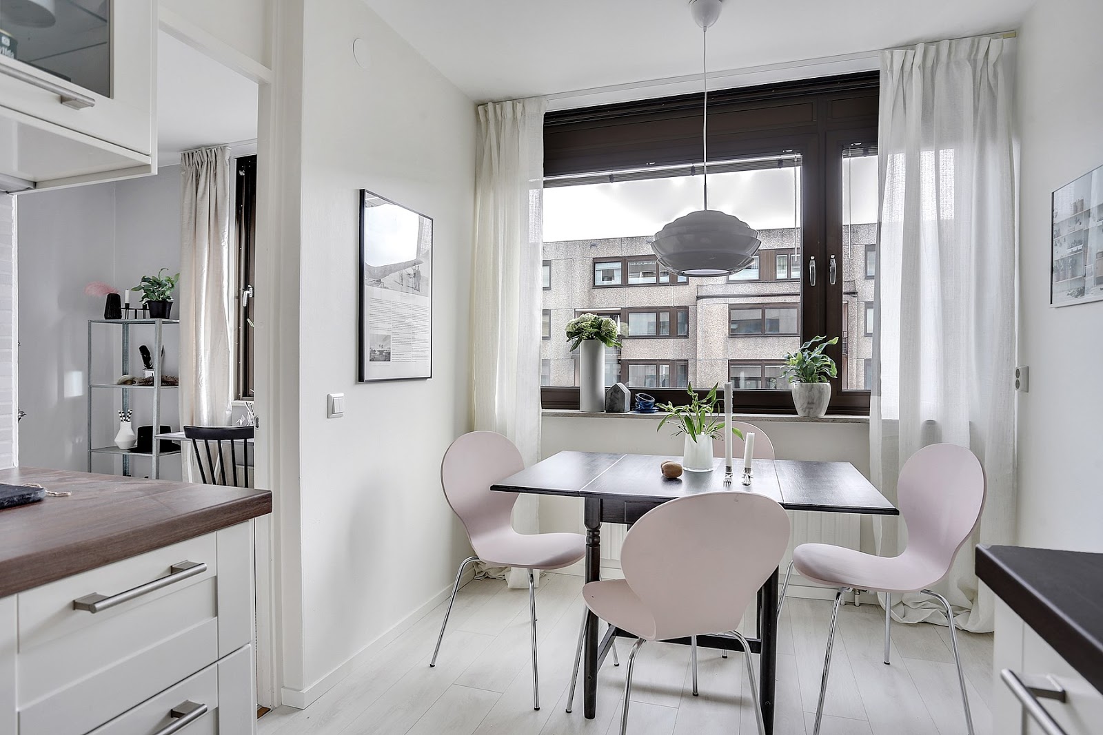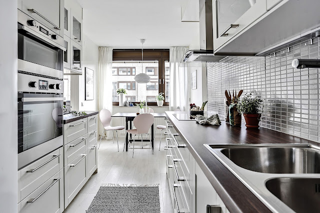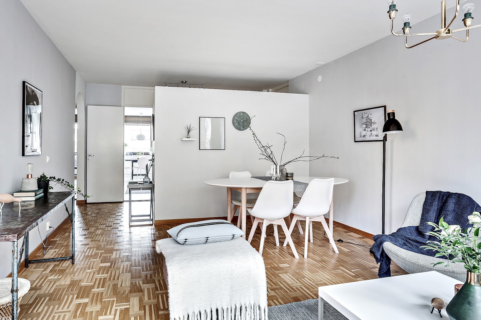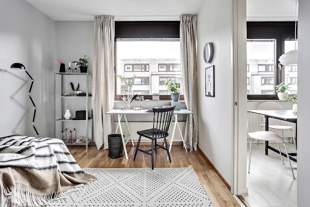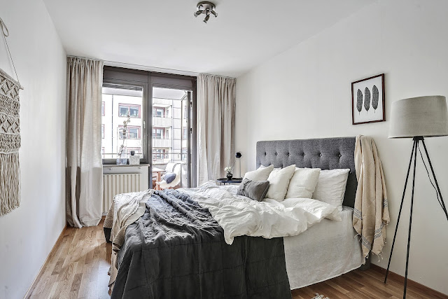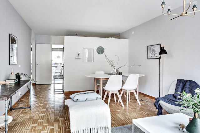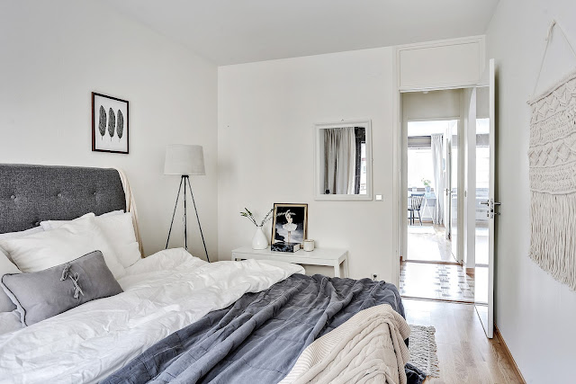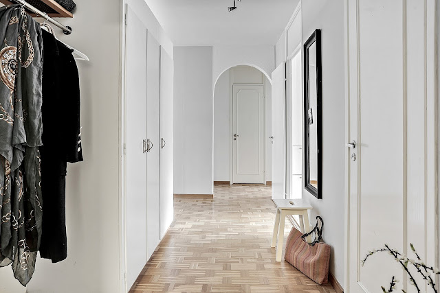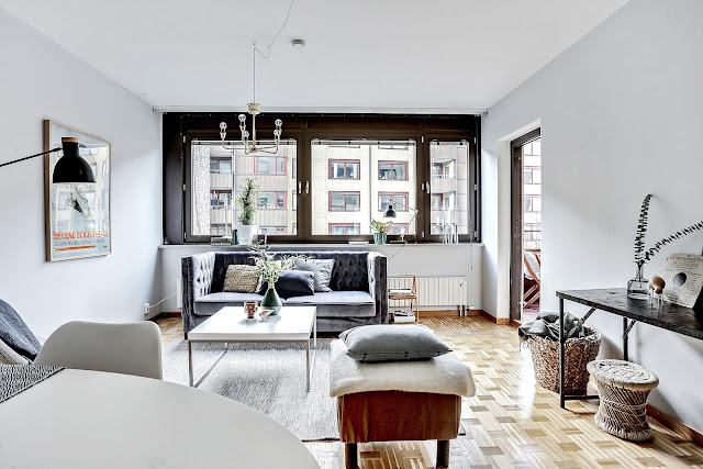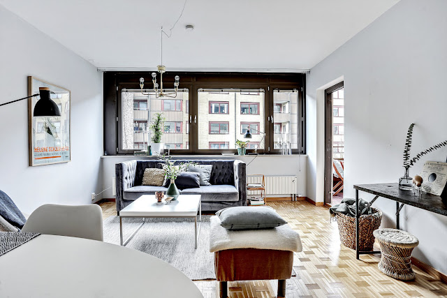 To trzypokojowe mieszkanie znajduje się w szwedzkim mieście Göteborg. Ma 83m2 powierzchni. Według mnie we wnętrzu widać delikatną inspirację stylem glamour m.in sofa, łóżko w sypialni, żyrandol. Oczywiście nie jest to typowy styl glomour (nie ma zdobnych tapet,fioletów i kryształów), tylko jego bardziej delikatna, skandynawska odsłona. Tutaj możecie przeczytać artykuł jak urządzić sypialnię w stylu glamour.
