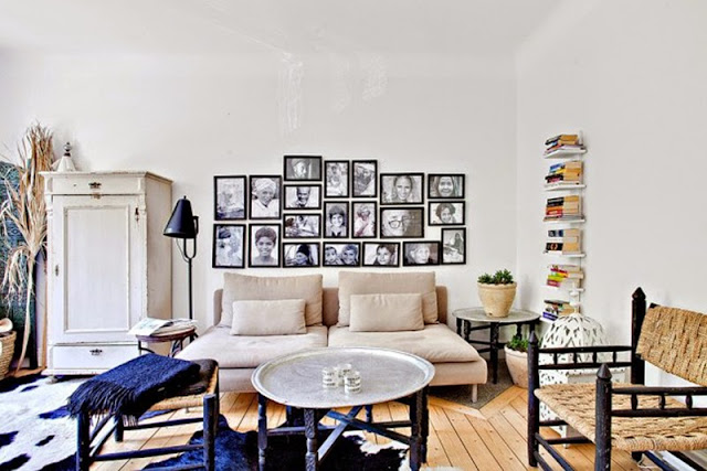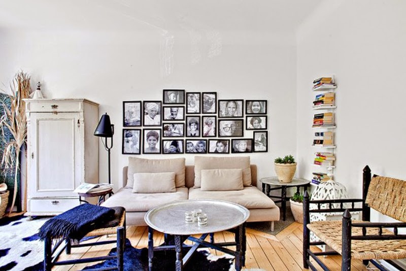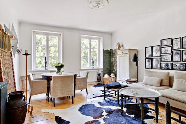 Mieszkanie w kolorach natury – biel, beż, brąz i dodatki czarnego. Wnętrze na ponadczasowy charakter, przytulne i praktyczne. Baza jest bardzo neutralna – białe ściany, brązowa podłoga. Dodatki tworzą ciekawą przestrzeń – ściana z czarno białymi obrazkami nad sofą i dywany (mam nadzieję, że to nie jest naturalna skóra).