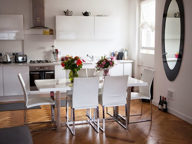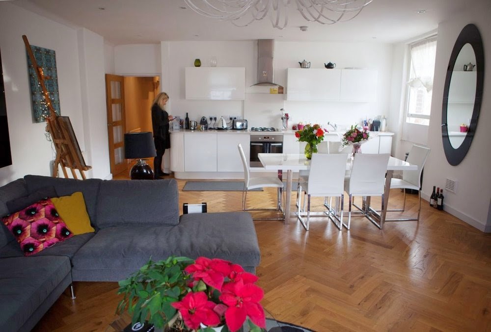 Mieszkanie w Londynie – pokój dzienny, biały aneks kuchenny oraz sypialnia