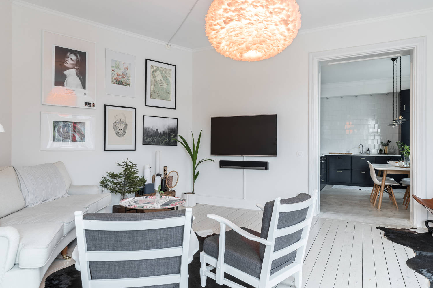 Skandynawski styl, niesymetryczny jasny pokój dzienny, kuchnia z dużym stołem (na min. sześć osób) oraz komfortowa sypialnia.