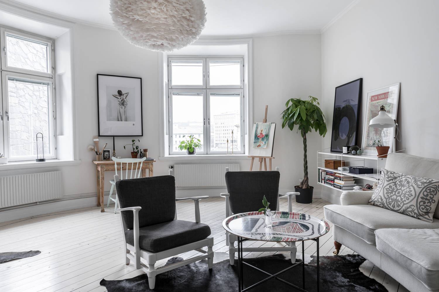 Mieszkania położone w starym budownictwie, często wybierane są przez artystów, którzy nie wyobrażają sobie życia w nowoczesnych komfortowych (ale dla „artystycznych dusz” często nudnych i bardzo podobnych) apartamentach. W takich wnętrzach jak w żadnych innych pasuje luźny styl aranżacji, taki jak swobodnie przewieszone oświetlenie (tutaj w sypialni), obrazy ustawione na stelażach i niesymetrycznie powieszone na ścianach (salon).