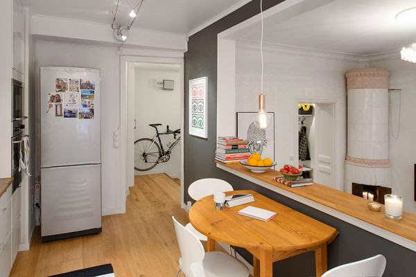 Mieszkanie położone w Szwecji i urządzone w stylu skandynawskim. Ma dwa pokoje: pokój dzienny połączony z aneksem kuchennym i sypialnię, powierzchni 60m2. Aneks kuchenny jest położony trochę wyżej niż salon, co dodaje oryginalności i fajne dzieli przestrzeń. W korytarzu widać powieszony rower, który ostatnio powieszony w salonie wzbudził wiele kontrowersji 😉