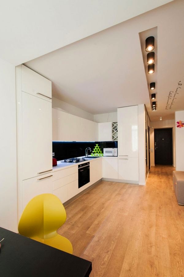 Mieszkanie typu studio położone na Ukrainie, Odessa.  Typ takiego wnętrza charakteryzuje się tym, że nie ma wyraźnego podziału na pokoje, tylko stanowi otwartą przestrzeń co niewątpliwie optycznie powiększa nam wnętrze. Strefy są jednak wyodrębnione, w tej aranżacji za pomocą bardzo pomysłowej ściany – półki z książkami. Mieszkanie jest nowoczesne i urządzone w jasnej kolorystyce: białe ściany, jasno brązowa podłoga, biała kuchnia. W ciemnych barwach zaaranżowano jedynie łazienkę.