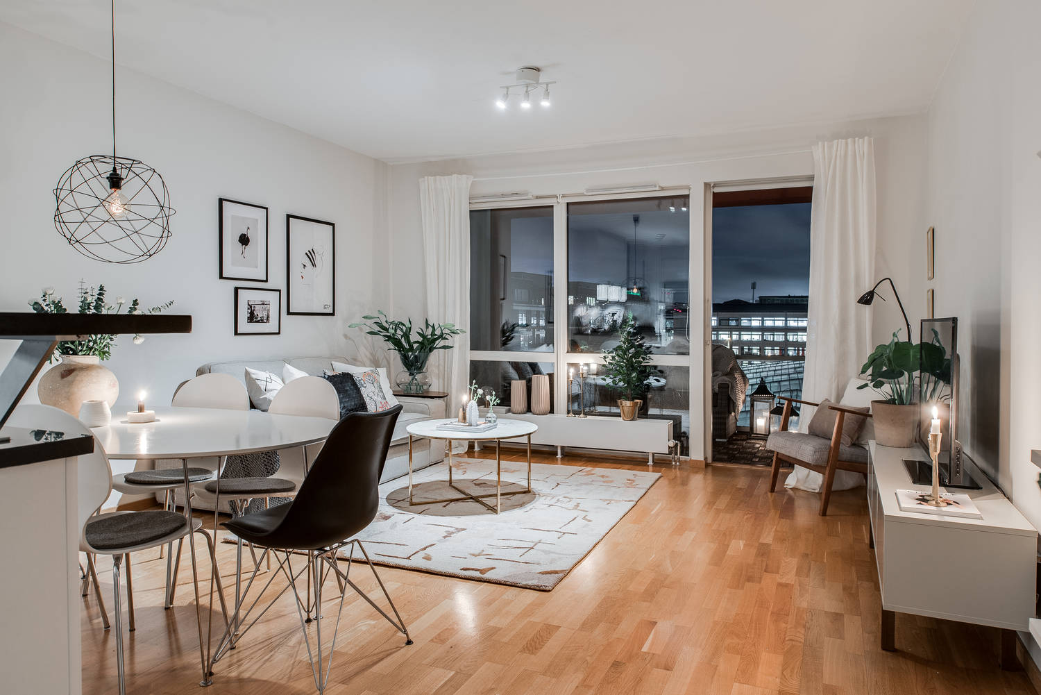Minimalizm jest bardzo popularny w skandynawskich wnętrzach. Zyskuje na popularności, gdyż sprawdza się w prawie każdej aranżacji. Podstawą stanowią białe ściany, jasna podłoga oraz niewielka ilość mebli. W takich aranżacjach bardzo istotną rolą odgrywają dodatki. Warto pamiętać, że w tak „neutralnej bazie” (czyli białe ściany, neutralne kolory mebli w niewielkiej ilości) wystarczy zmienić poduszki, zasłony, obrazki czy oświetlenie i już mamy „nową osłonę” naszej aranżacji!