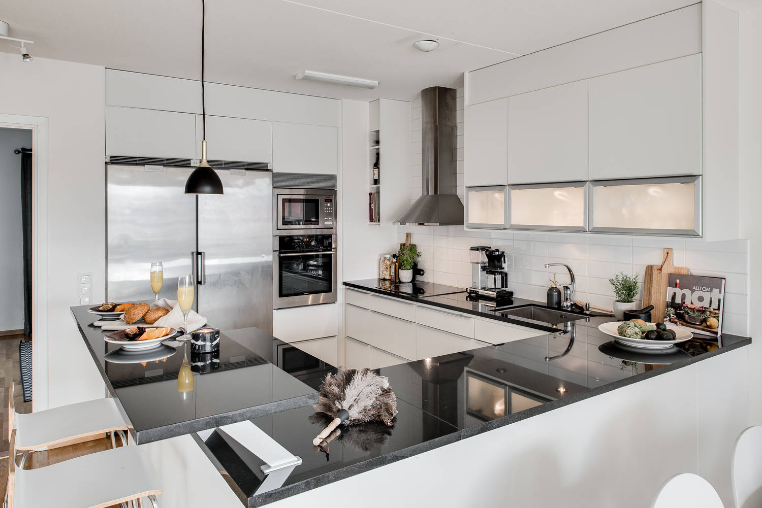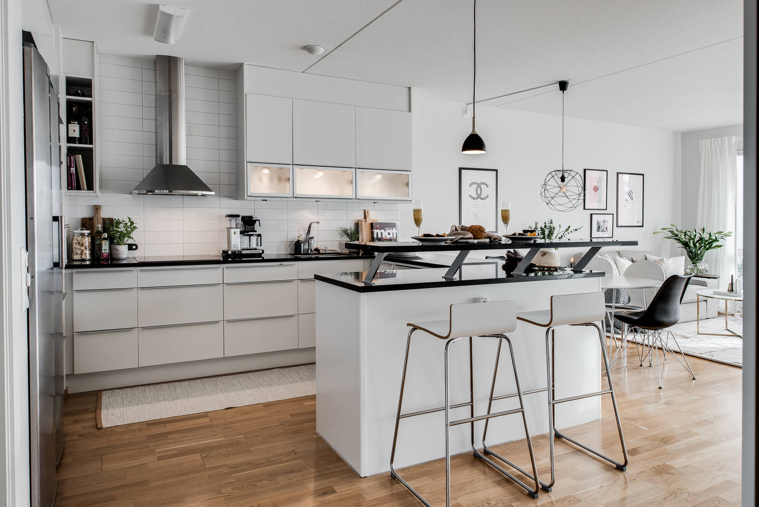W tej aranżacji połączono kilka kolorów: biel (ściany, stolik, krzesła, poduszki, zasłony, a także meble kuchenne), szarość (sofa, fotel), beżowe (podłoga) oraz czerń (krzesła, oświetlenie).