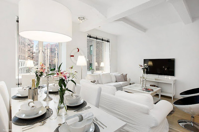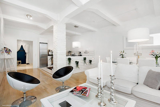Mieszkanie ma mniej niż 70m2, jest położone w Szwecji. Dwie białe sofy, stół to część dzienna połączona z aneksem kuchennym. Szafki kuchenne oczywiście białe, uwagę zwraca duży ekspres to kawy (jak w kawiarni) oraz obraz na stelażu malarskim, na białym tle.
