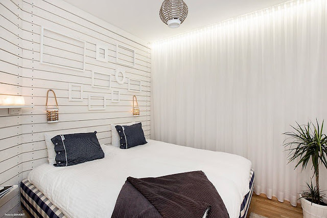W sypialni warto zwrócić uwagę na ścianę nad łóżkiem, a na niej jako ozdoby puste białe ramki. Łazienka to oczywiście piel w połączeniu z drewnem. Podoba się Wam aż tak biało we wnętrzach?