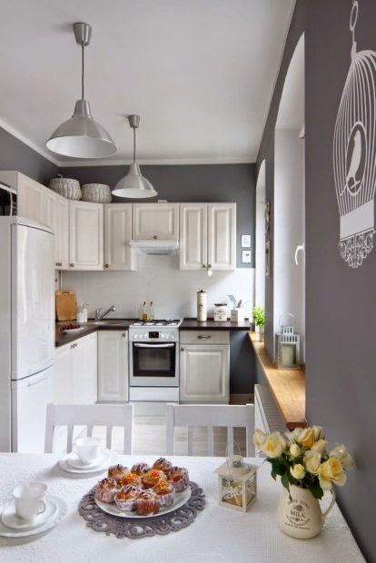 To mieszkanie znajduje się w kamienicy. Ściany są szare, ale kontrastują z białymi meblami i jasną podłogą. Przestrzeń ma charakter otwarty, nie ma drzwi, ale widoczny jest podział „na strefy”. Sypialnia znajduje się za ścianą, co czyni ją strefą prywatną. We wnętrzu jest dużo światła, nie ma firanek w oknach, tylko „lekkie” rolety. Naklejki oraz obrazki na ścianach ozdabiają to mieszkanie i nadają fajnego klimatu (zarówno ptaszek w klatce, jak i napis z bardzo inspirującym tekstem). Więcej zdjęć można obejrzeć tutaj.