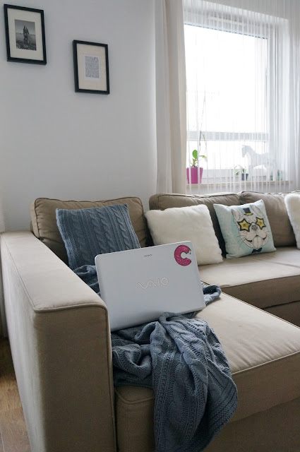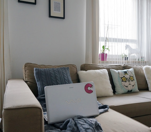 Ja swój narożnik ozdobiłam poduszkami: zestaw z kocykiem – pochodzi z Jysk, białe poduszki z Muzpony, a ten z uroczym buldogiem wyszperałam w Tk Maxx-ie. Komputer Vaio Sony to sprzęt na którym obecnie pracuje 🙂 na sofie oczywiście.