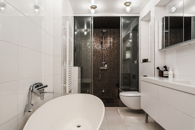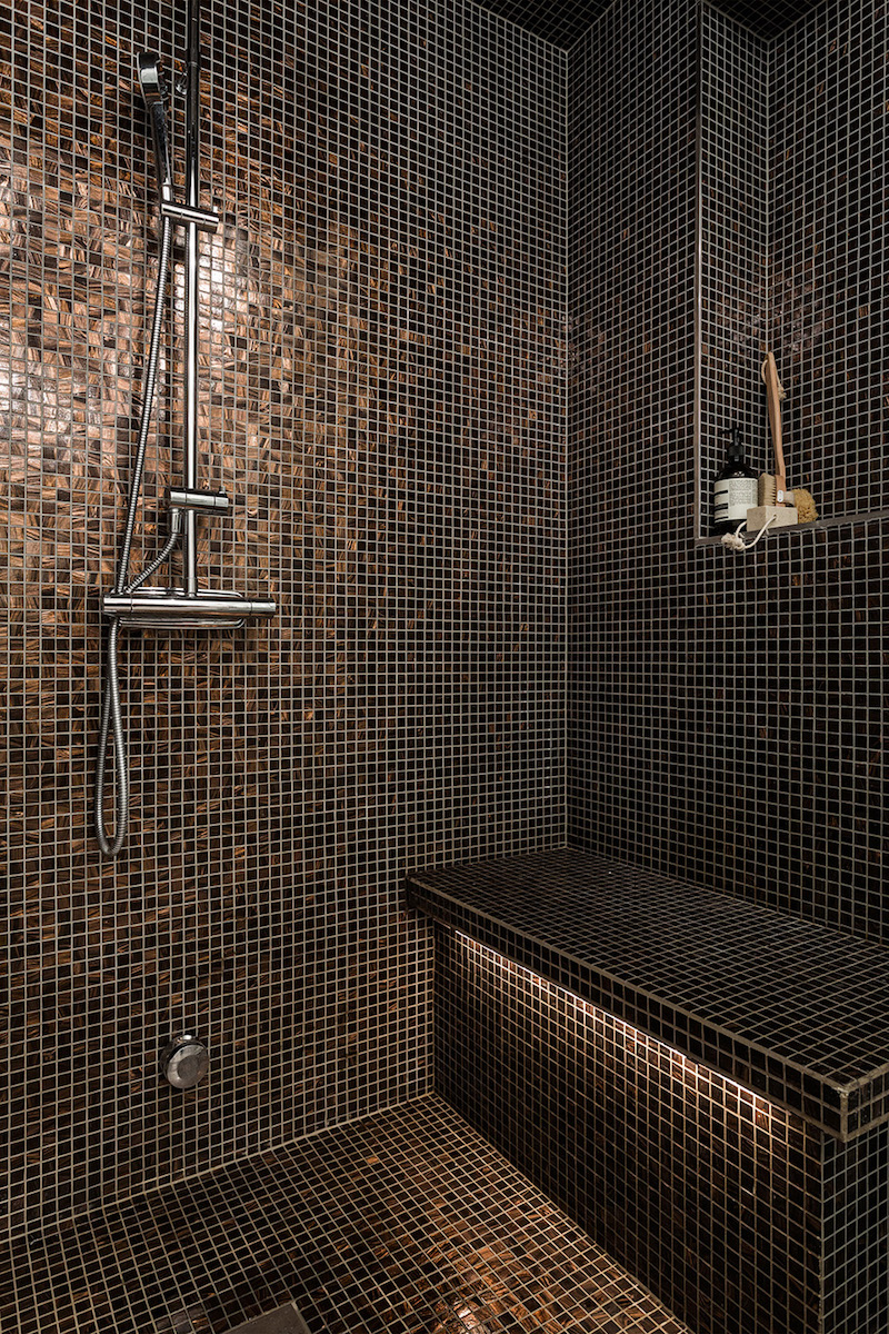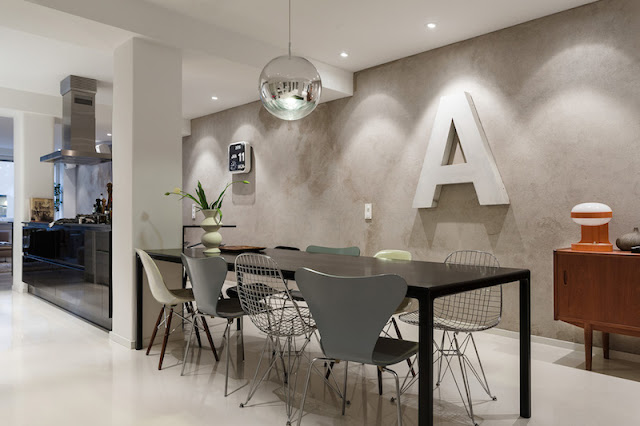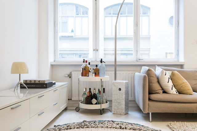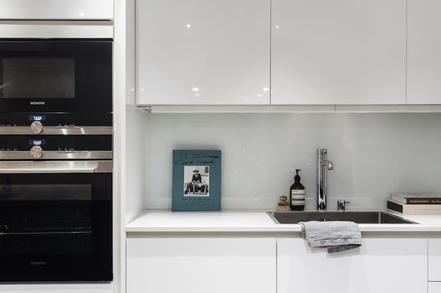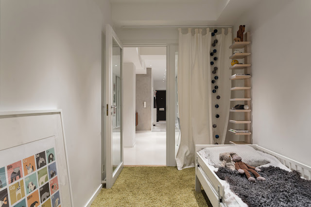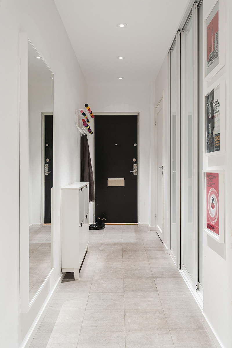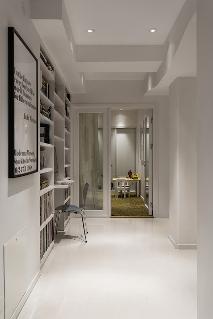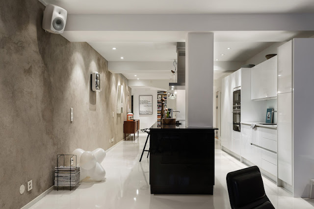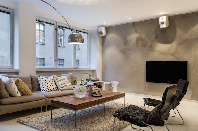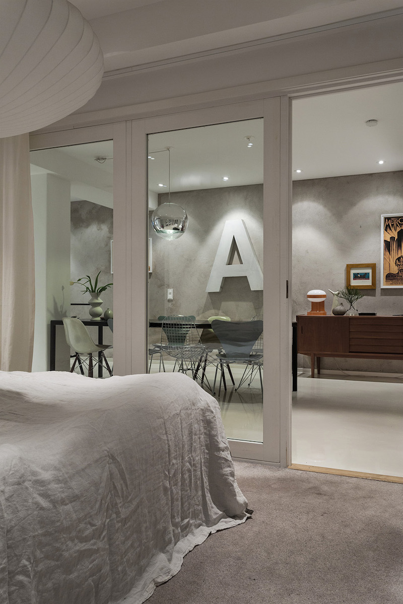Nowoczesne mieszkanie o powierzchni 123m2. Położone w stolicy Szwecji, Sztokholmie. Wnętrze jest w dużej części otwarte (połączony salon z kuchnią, pokoje mają szklane przeźroczyste drzwi).