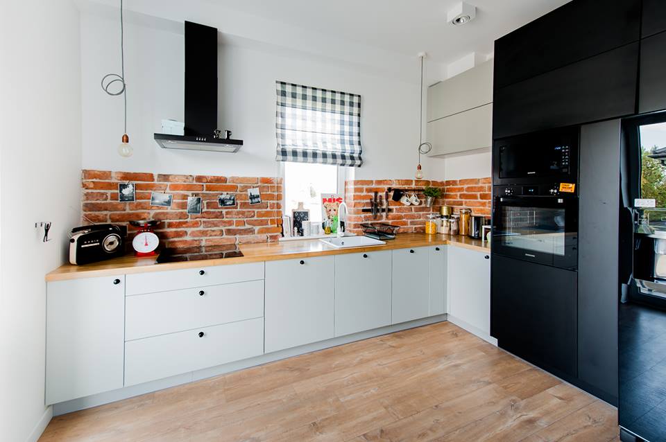 Ulubionym pomieszczeniem Kariny (właścicielki i projektantki) jest łazienka. Chciała ona zastosować jak najmniejszą ilość płytek, stąd pomysł na ceglaną ścianę, panele oraz szkło pod prysznicem. Karina jest zakochana w naturalnej cegle, dlatego też wykorzystała ją także w kuchni.