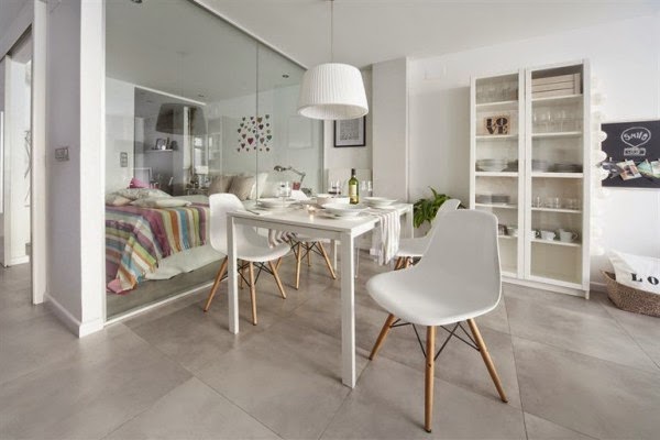Nowoczesne mieszkanie typu studio. Wnętrze ma dwa pomieszczenia, ale oddzielone szybą, optycznie tworzą całość 🙂 Jest urządzone w stylu nowoczesnym, ale z domieszką skandynawskiego designu ! Wnętrze jest jasne, dużo bieli połączono z kontrastowymi dodatkami. Urządzono tu także bardzo przyjemny „kącik do pracy”, którego nowoczesność podkreśla designerskie krzesło Panton.