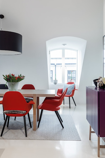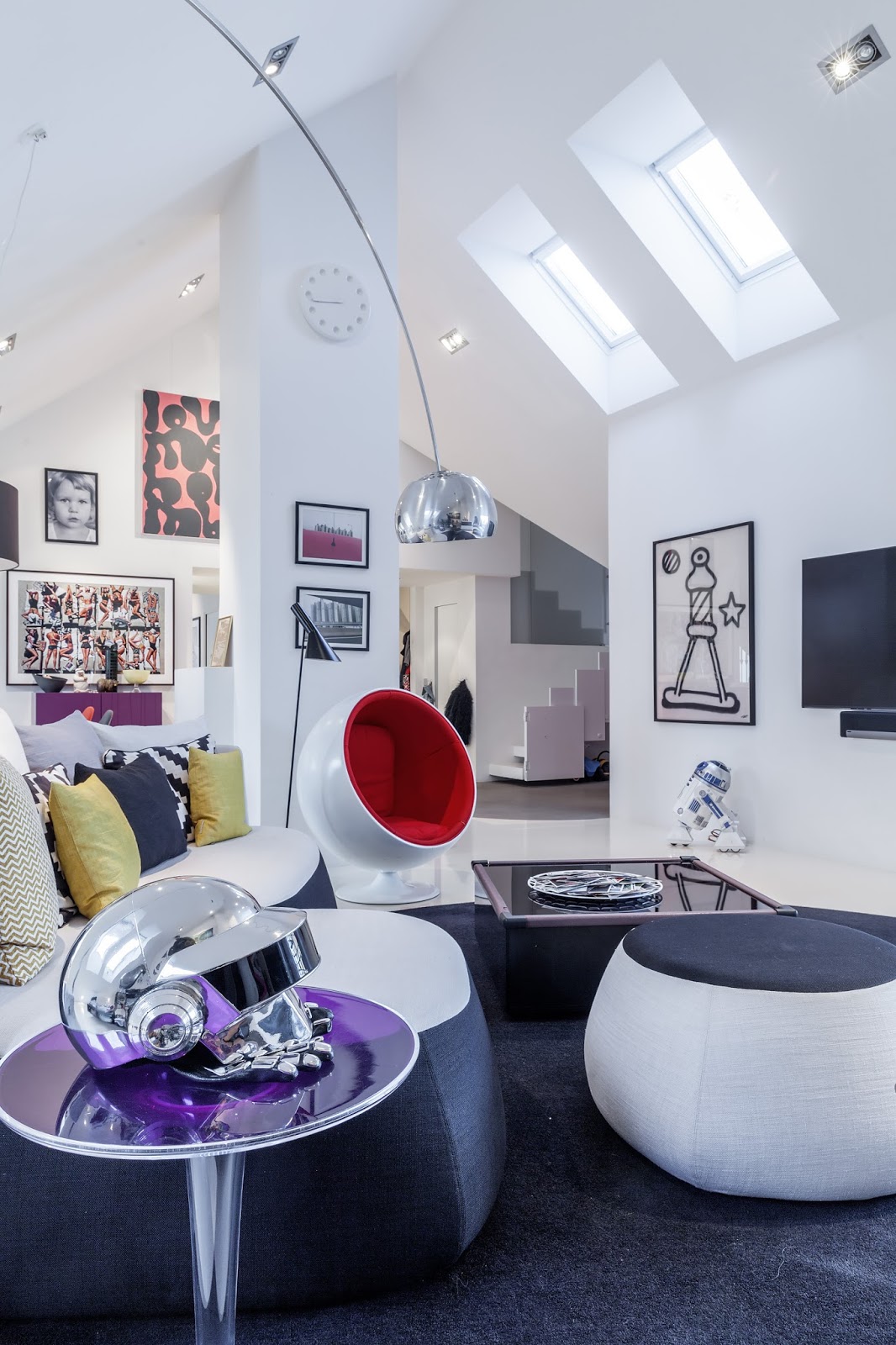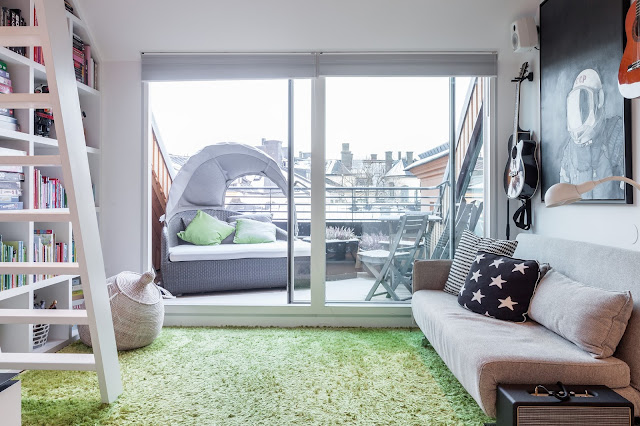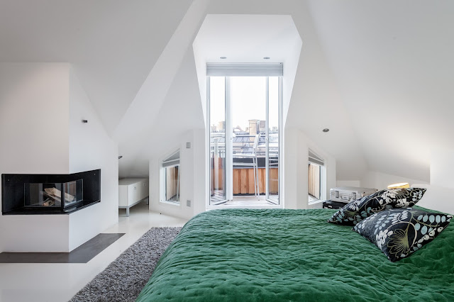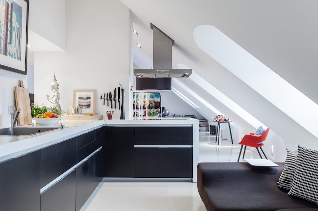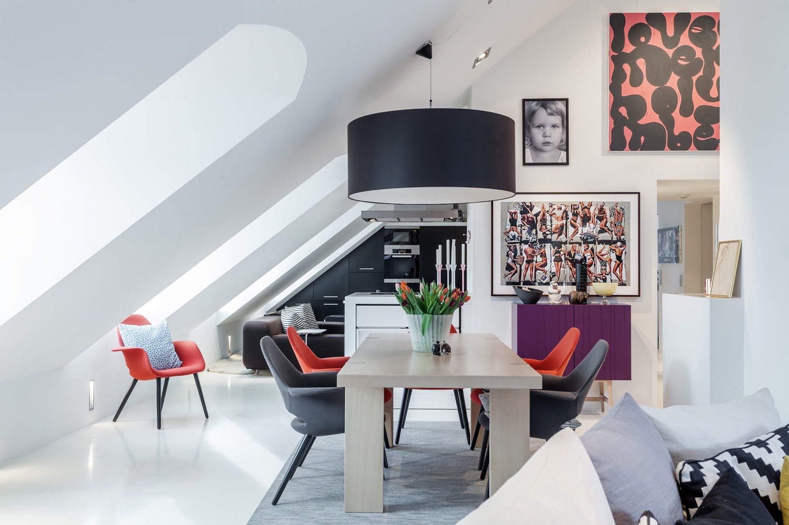 Dzisiaj prezentuje nowoczesne mieszkanie położone w stolicy Szwecji, Sztokholmie. Jest to tzw. penthouse czyli luksusowe mieszkanie położone na ostatnim piętrze budynku. Skośne białe ściany i wysokiej jakości nowoczesne meble i dodatki w różnych barwach.