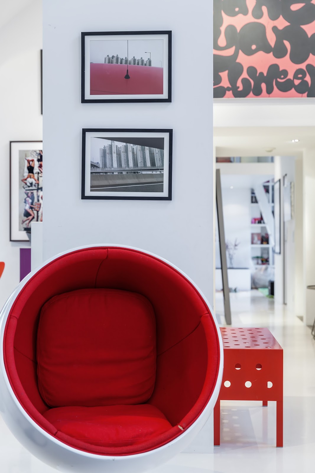 Warto zwrócić uwagę na szczegóły, wnętrze jest wysokie zatem obrazki powieszono nawet blisko sufitu, a także „wypełniono” oświetleniem – lampą typu wędka, bardzo dużą czarną lampą nad stołem.