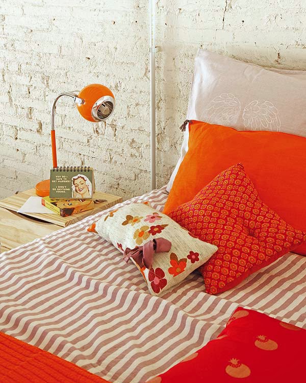 To mieszkanie położone jest w Barcelonie, urządzone jest w stylu nowoczesnym z dekoracyjnymi elementami „loftowymi” – cegła na ścianach, widoczne rury wentylacyjne, wysokość sufitu i jego wykończenie, antresola. W całym wnętrzu pojawia się akcent w kolorze pomarańczowym w postaci mebli i dodatków. Ciekawym elementem jest także stolik zrobiony z palety, jednak coraz mniej oryginalnym (nie wiem czy zauważyliście w jak wielu aranżacjach wnętrz możemy go spotkać).