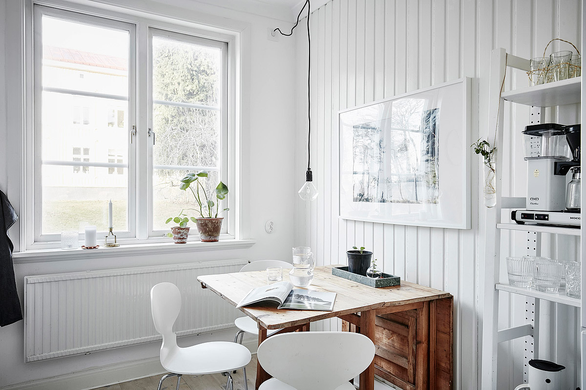 Szczególnie w takich wnętrzach jak powyższe, czyli – powiedzmy – skandynawski styl, sprawdzają się obrazy w odcieniach szarości (z przewagą białego), umieszczone w czarnej ramie 🙂