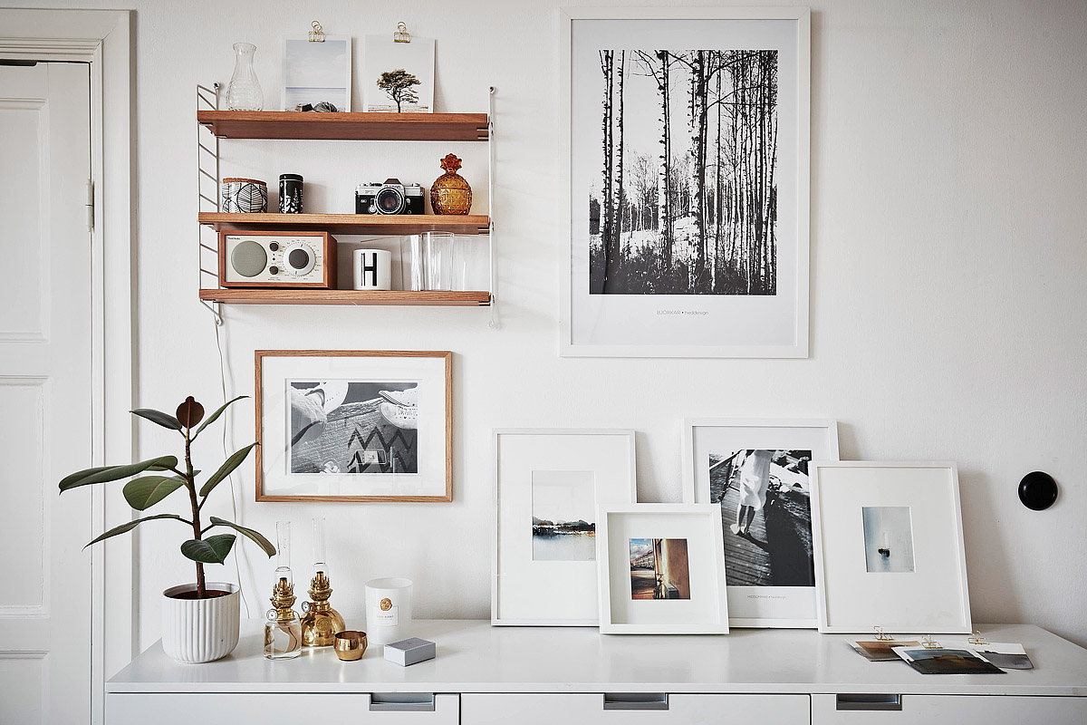 Ta aranżacja dwupokojowego mieszkania (52m2) jest świetnym przykładem na to jaki klimat potrafią stworzyć obrazki. Grafiki i zdjęcia zawieszono na ścianach, postawiono na półkach, komodzie i podłodze. Jest ich całkiem sporo, jednak wszytko zostało zaplanowane w taki sposób, by razem tworzyło spójny design!