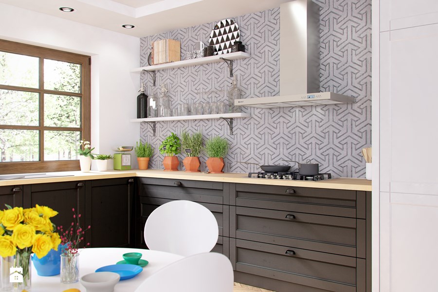 Na dobre zagościły tu klasyczne formy oraz rzeźbione drewniane fronty. Okap w