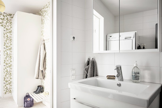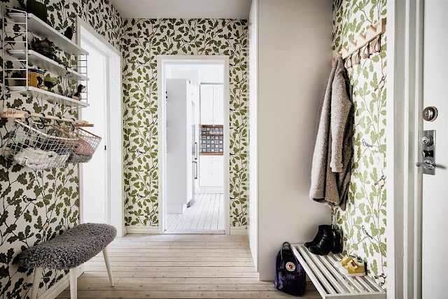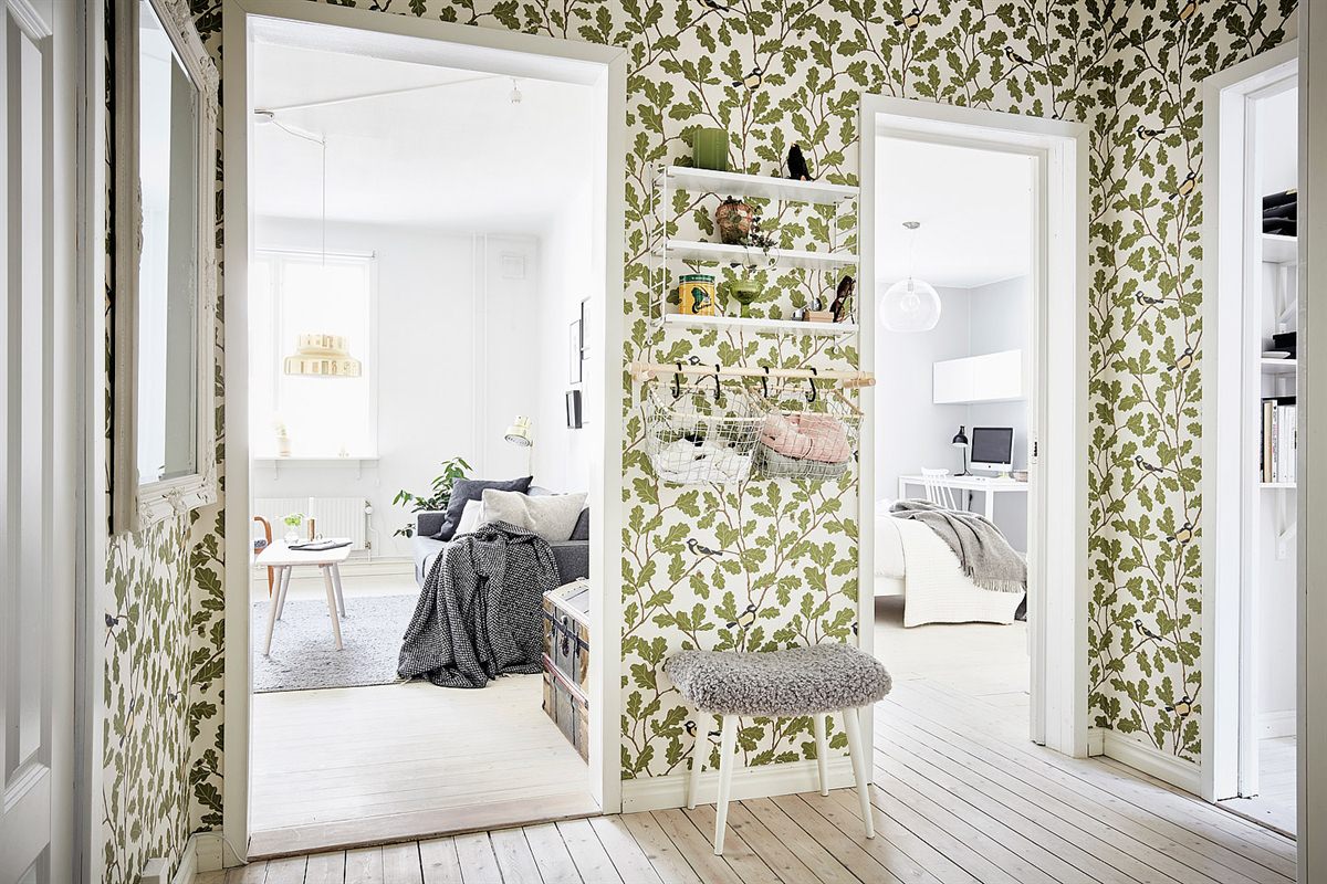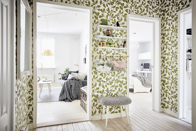 Świetne mieszkanie 🙂 Podoba mi się zastosowanie kolorów. Bardzo fajna roślinna tapeta.