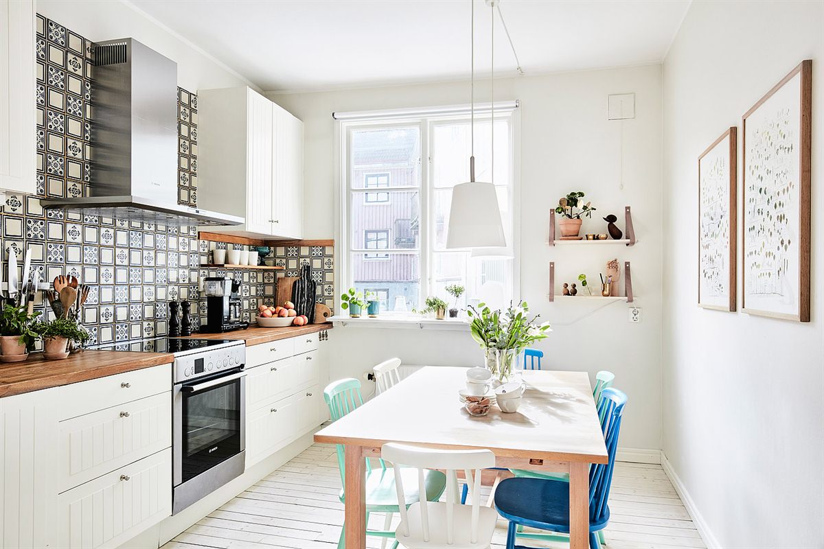 W tej kuchni pastelowe są krzesła, równie dobrze te kolory wyglądają