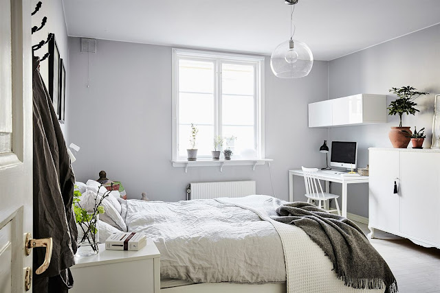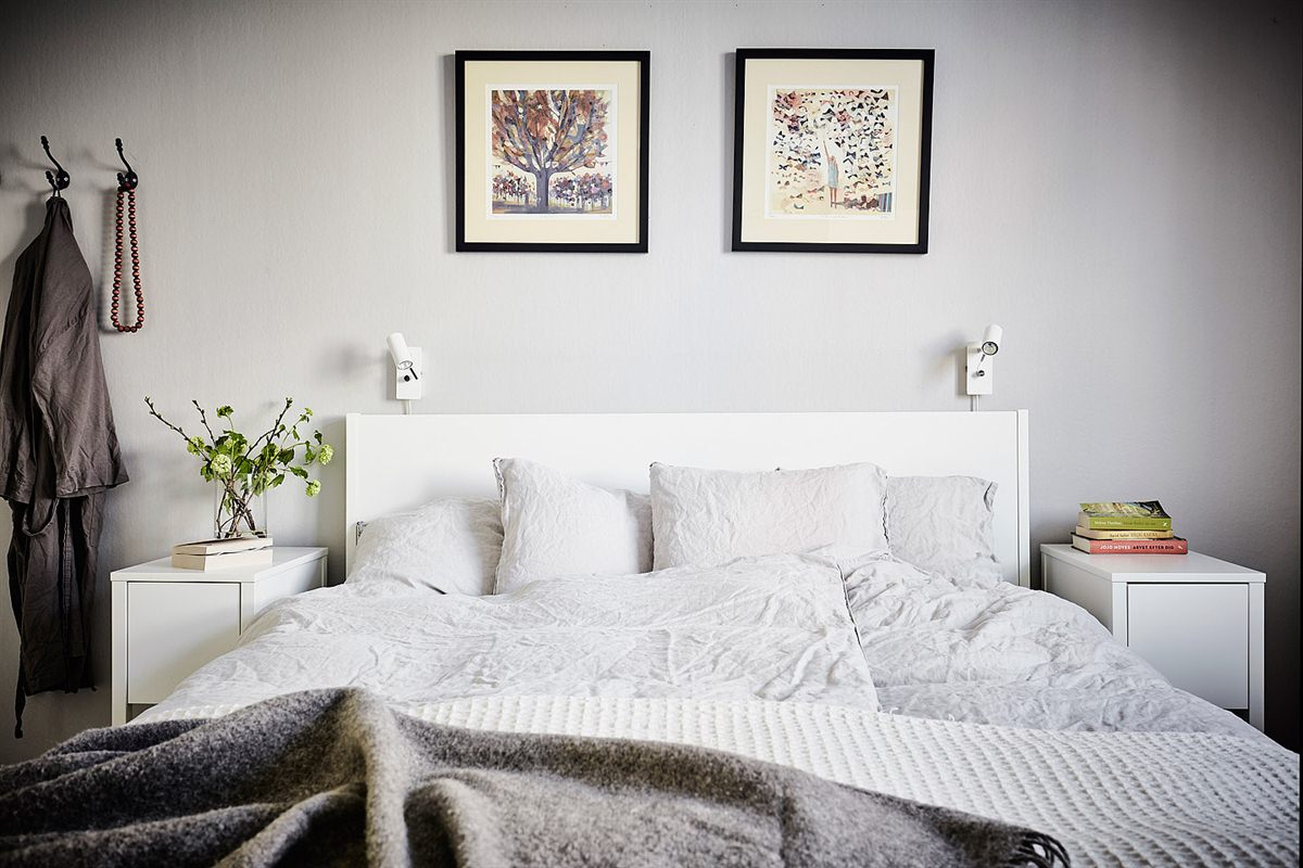 W tej sypialni kolorystyka jest raczej klasyczna, typowa dla skandynawskich aranżacji. Do pastelowych kolorów można zaliczyć farbę na ścianie – lila. Nie mamy tutaj pastelowych dodatków, ale jak przy wyborze wszystkiego ważny jest umiar, nie musimy decydować się na pastelowe kolory w każdym pomieszczeniu. W tej sypialni za to bardzo fajnie połączono miejsce do pracy, z typową relaksacyjną funkcją sypialni, do której niezbędne jest wygodne łóżko!