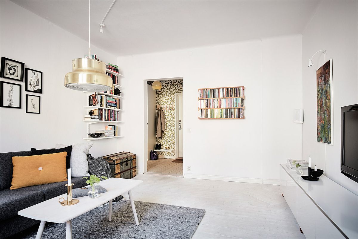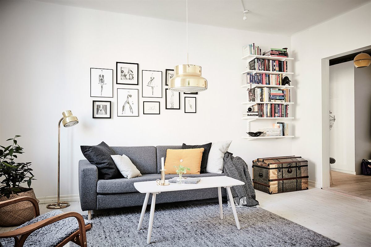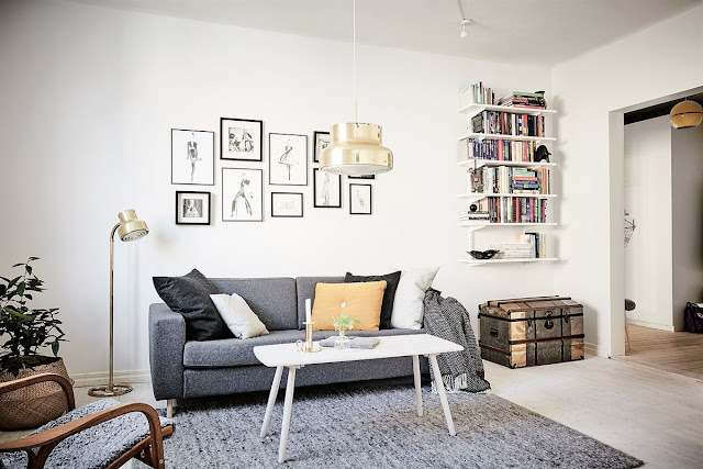 Salon podobnie jak  sypialnia nie ma nadmiernej ilości pasteli (jedynie dodatki, okładki książek na półkach). Jednak stworzono jasną, przytulną przestrzeń idealną na relaks dla całej rodziny. Ciekawie także wyglądają złote oprawy lamp. Ten kolor także fajnie komponuje się z pastelowymi barwami.