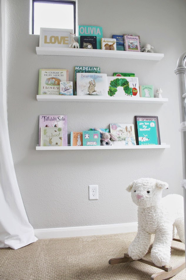 Przedstawiam pokój dla dziecka w pastelowych barwach. Ściany zostały pomalowane na szaro, a meble są także szare i uniwersalne białe. Wnętrze ożywiają miętowe girlandy zawieszona na łóżeczku dla niemowlaka oraz wystawka kolorowych książek na półkach.
