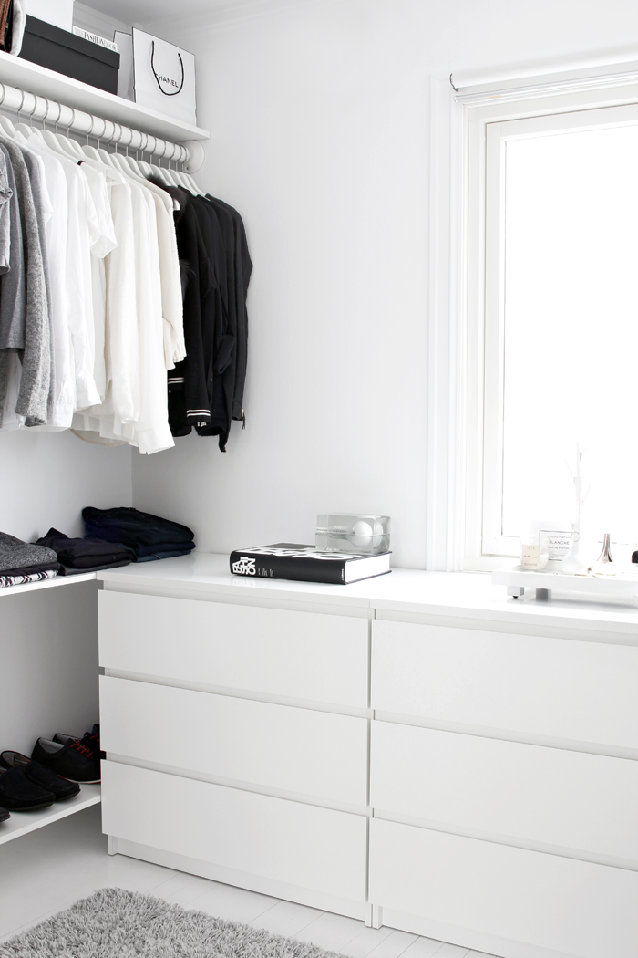 Jak powinien być urządzony pokój typowo kobiecy – może właśnie tak? Czyli pokój pełen kosmetyków, butów i ubrań. W tym wnętrzu jest garderoba i miejsce do wykonania makijażu. Wszystko w jasnej kolorystyce, przedmioty starannie ułożone, ale większość mebli z popularnego sklepu IKEA (komoda, lampy), więc jakby się Wam coś spodobało to łatwo odtworzyć 🙂