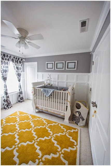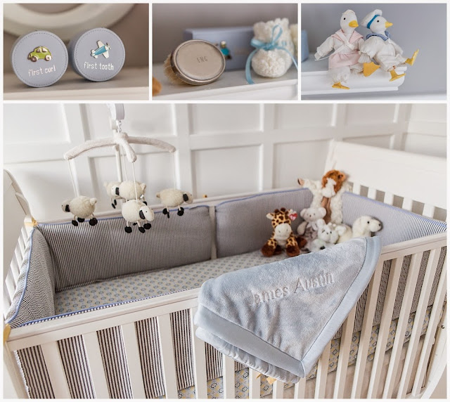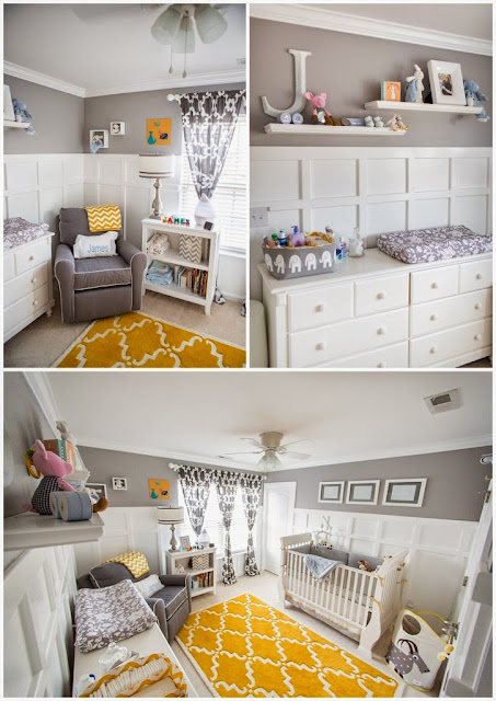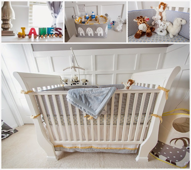 Pokój dziecięcy, jak go urządzić? Można na wiele sposobów. Ta aranżacja to pokój dla małego chłopca, 3 miesięcznego Jamesa. To wnętrze pochodzi z „za oceanu” i ma charakterystyczne dla tamtego designu płyty (białe) do trzy czwarte poziomu ściany. Na górnej części ściany pomalowane na szaro. Meble w tym pokoju dziecięcym są białe: łóżeczko, komoda, szafka do tego szary fotel. Wnętrze ożywione żółtymi dodatkami: dywan, obrazki i kocyk. Imię James pojawia się w postaci zabawek i w postaci haftowanego napisu na akcesoriach. Całość wygląda przytulnie i nowocześnie.