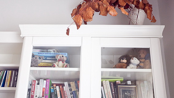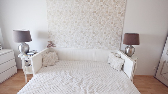 Wnętrze urządzone w stylu romantycznym, białe zdobione meble, białe ściany oraz dodatki w stylu prowansalskim. W pokoju rozkładana sofa – łóżko, biurko z krzesłem, regał – witryna połączony z szafką na rtv, na korytarzu toaletka. Większość mebli pochodzi ze sklepu IKEA, więc jeśli coś przypadło Wam do gustu, to łatwo skopiować ten styl. Na zdjęciach można też podziwiać sympatycznego mieszkańca tego mieszkania.
