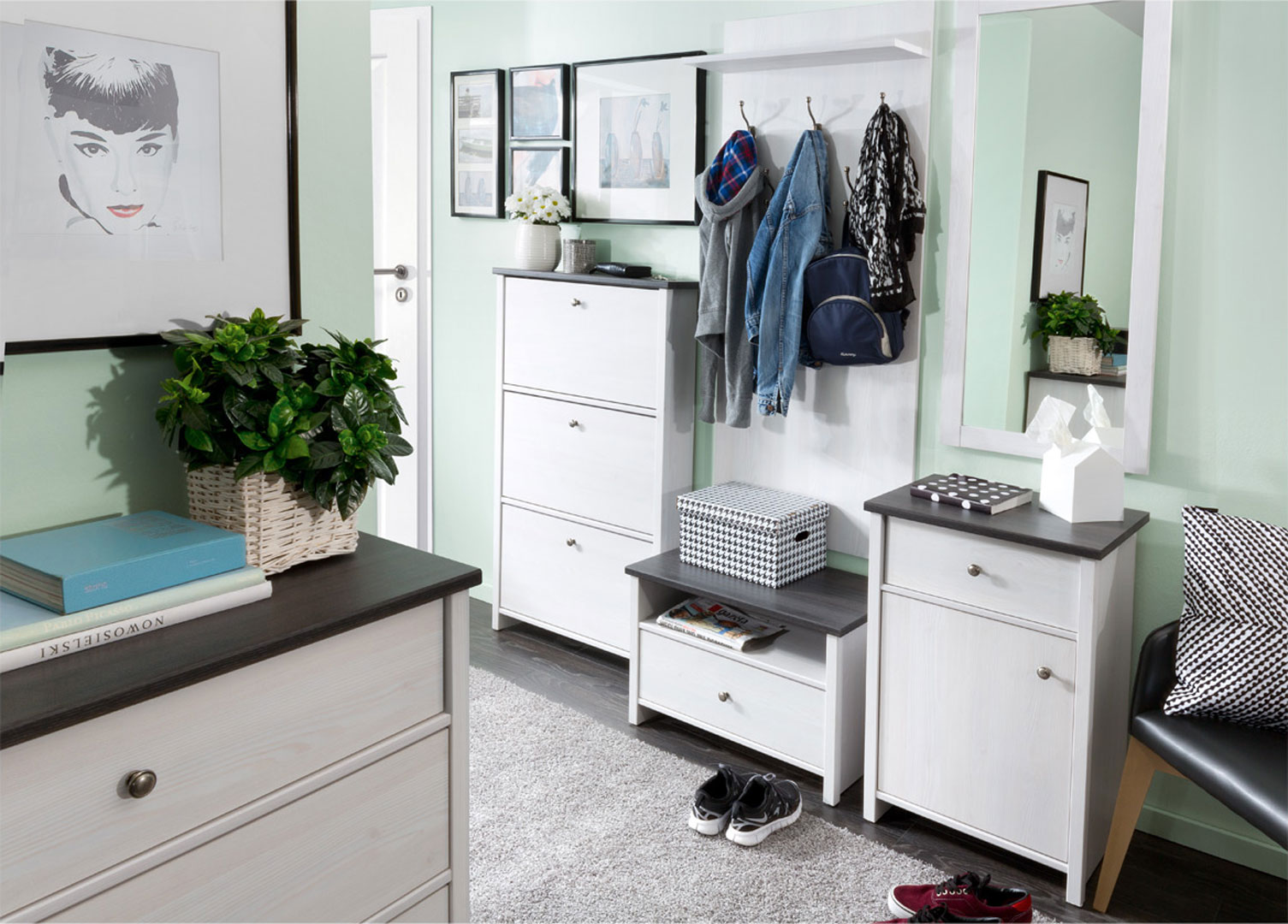 Kolejnym praktycznym i niezbędnym meblem w przedpokoju jest szafka na buty. Na zdjęciach widać fajne propozycje także z oferty Black Red White, są to kolekcje Porto (zdjęcie nr 1) i Nepo (zdjęcie nr 3). W obydwu systemach, można znaleźć fajne szafki na buty – cena od 129 zł – jest także wersja szafki o nazwie Go ( cena: 289 zł), która posiada funkcję ławeczki, czyli można wygodnie zasiąść podczas zakładania butów.