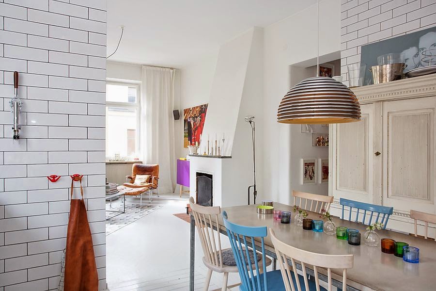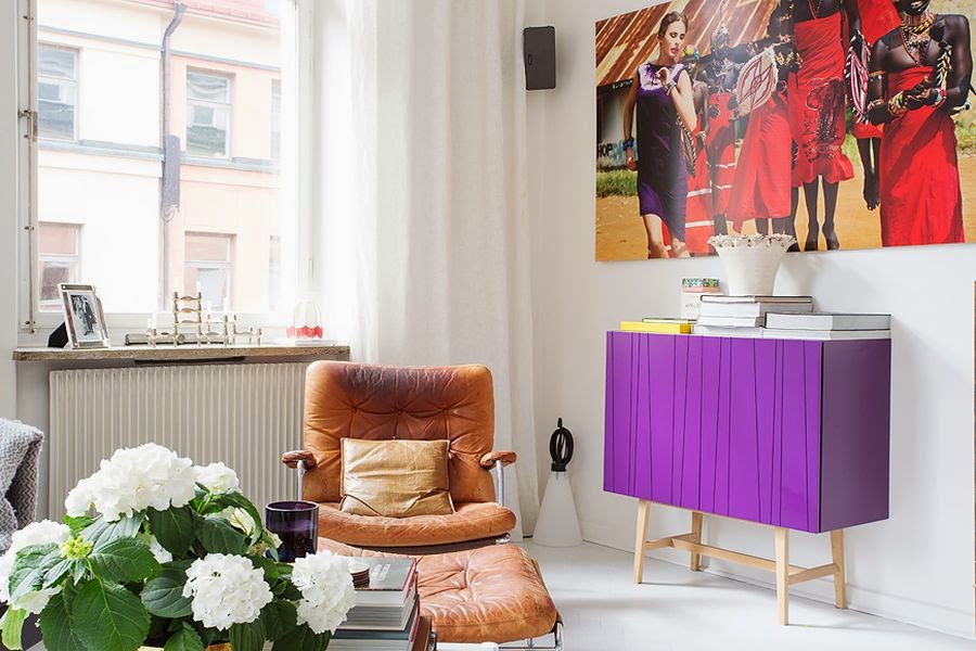 Przestronne mieszkanie o powierzchni 91m2. Przestrzeń dzienna połączona z kuchnią, sypialnia, pokój dla dziecka i łazienka.  Duże prawie nie osłonięte okna wpuszczają do wnętrza sporo światła. W aranżacji bardzo ciekawą rolę odgrywają detale: fioletowa szafka czy złota bateria tworzą niepowtarzalny klimat ! Każde pomieszczenie jest inne, ale razem świetnie się przenikają i współgrają aranżacyjne. Mieszkanie położone w Skandynawii, więc urządzane w tej stylistyce: dużo bieli, światła, jak najmniej niepotrzebnych mebli.