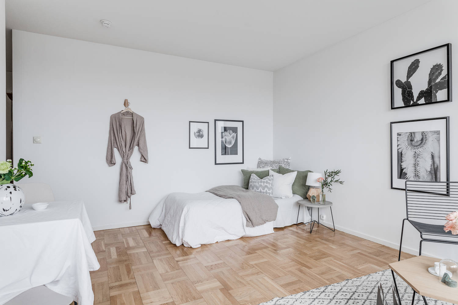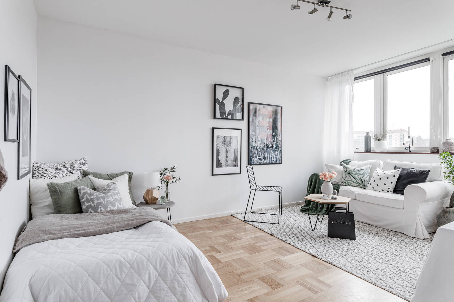 W czym „tkwi sekret”? W minimalistycznej skandynawskiej aranżacji: białe ściany, drewniana ponadczasowa podłoga,niewielka ilość mebli (nowoczesna jest jedynie sofa z ikea), a także dobrym doborze dodatków – zdecydowano się na plakaty w czarnych ramkach, miękkie poduchy i narzuty.
