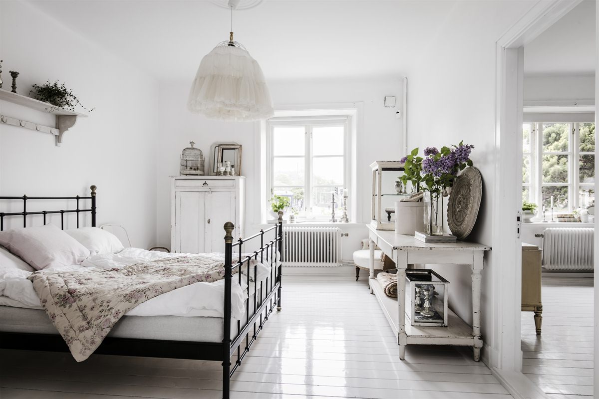 Druga aranżacja (zdjęcia 3-5) jest bardzo jasna. Duże metalowe łóżko dobrze komponuje się z szafkami i witrynami w prowansalskim stylu. Kobiecego charakteru nadają urocze „bibeloty”, kwiaty oraz pościel w kwiatowe wzory.