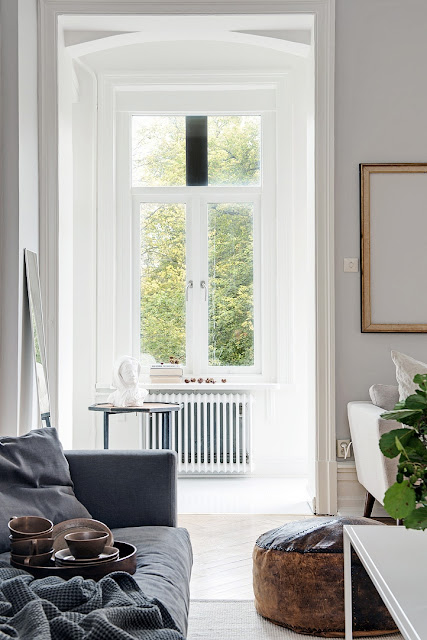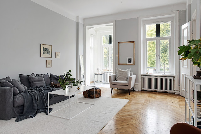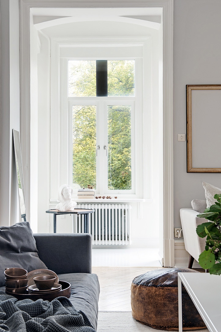 Ten salon (pokój dzienny) to część ponad 100 metrowego mieszkania położonego w Szwecji. Łączy on w swojej stylistyce wnętrze klasyczne i minimalistyczne. Pierwszy styl określają zdobienia, sztukateria, a minimalizm to głównie rozwaga w doborze dodatków i mebli. Świetnie widać to na przykładzie ramy, która spełnia funkcje obrazka. Jest klasycznie zdobiona, pozłacana, ale bez grafiki czy obrazka w środku. We wnętrzu dominują jasne, stonowane barwy: jasnoszare ściany, brązowa podłoga. Mieszkanie położone jest w budynku przedwojennym, kiedy w architekturze wnętrz dominowało wysokie budownictwo (sufit), naturalne materiały (duże drewniane drzwi) i przestrzeń.